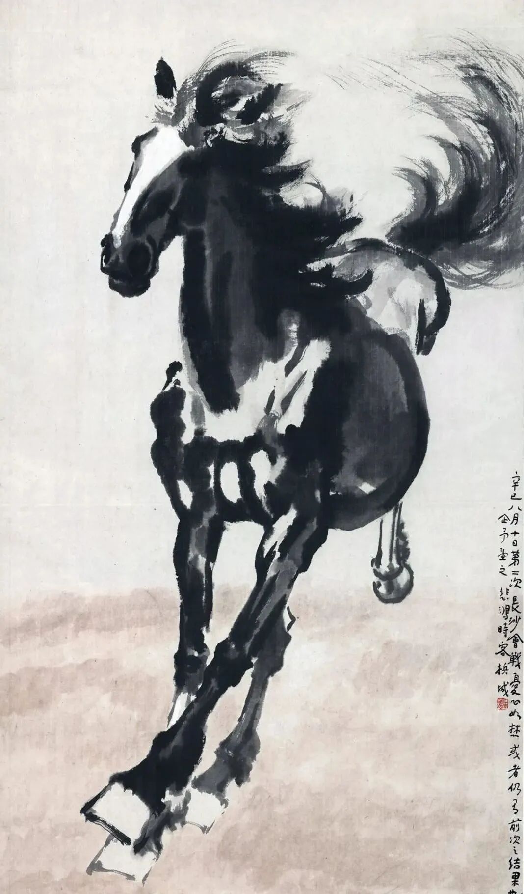 在抗日战争时期,徐悲鸿创作了多幅奔马图,画面中的马昂首扬尾,四蹄腾空,充满了力量与动感,寄托了他对祖国命运的担忧和对革命胜利的期盼。1941年,徐悲鸿在新加坡举办画展,为抗日救国募捐,他创作的《奔马图》以其强烈的艺术感染力,打动了无数观众,为抗战事业筹集了大量资金。