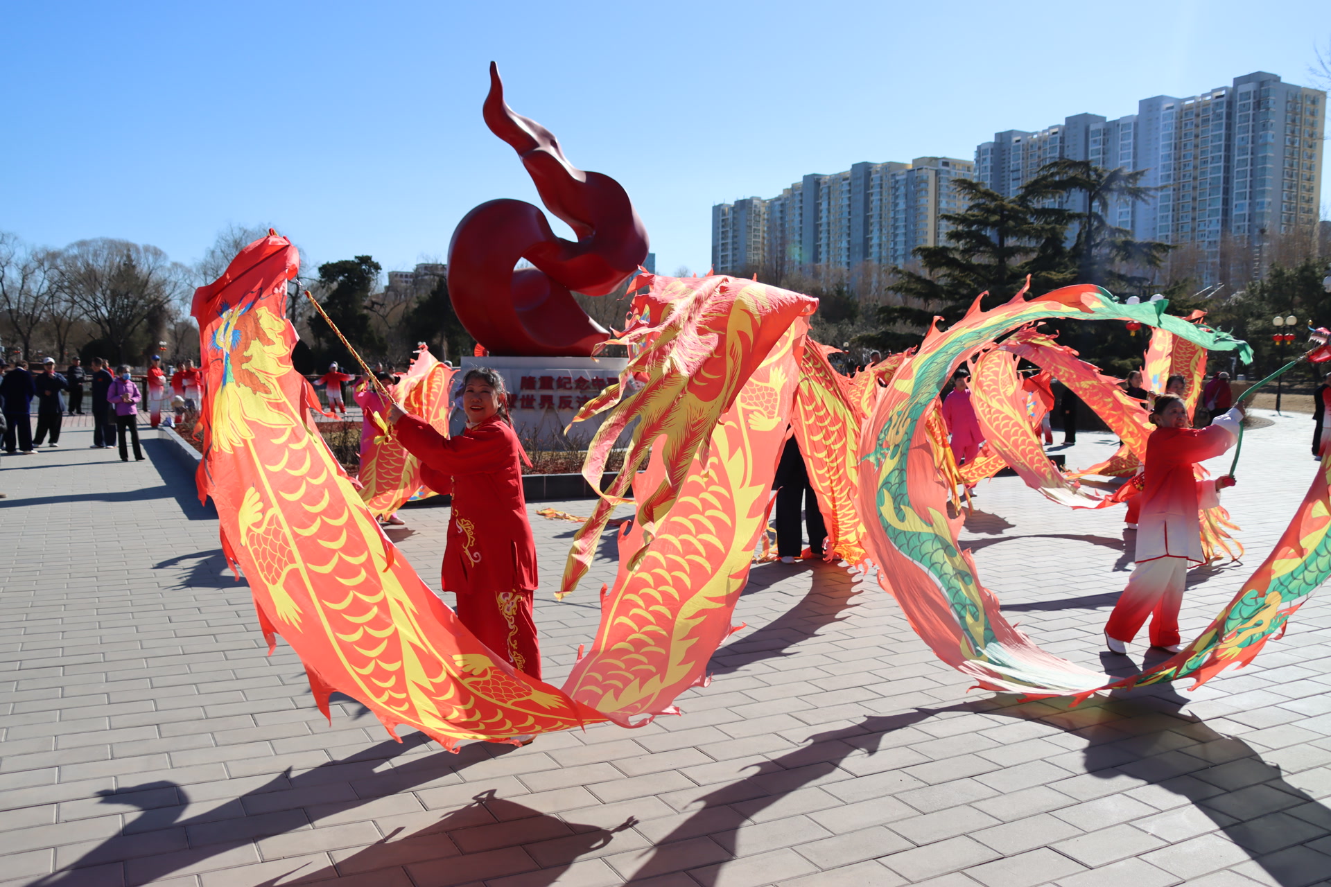 八段锦展示的余韵未消,参与者手持彩带龙道具快步入场。只见他们手中的彩带龙长达 约5至8米,红色的龙身缀满金色亮纹,在阳光照耀下流光溢彩。“龙抬头!”领队一声吆喝,十余条“彩龙”同步昂首,表演者手腕轻旋,龙头瞬间腾空而起,亮片折射出点点金光。王淑华也是彩带龙项目的参与者,她说:“舞彩带龙不仅要臂力足,还要全身协调,非常锻炼身体。大年初二舞龙,不仅是健身,更是在传承年味!”