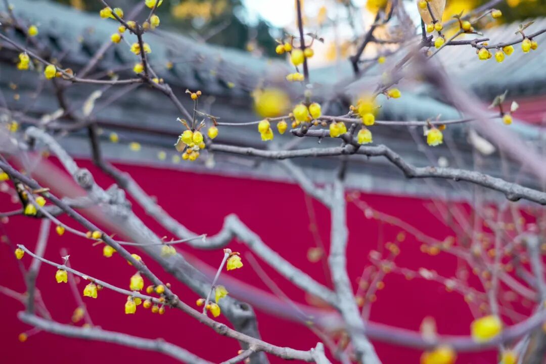 另一处赏蜡梅佳境便是碧云寺,这座依山而建、殿宇错落的古刹,是香山极具古韵的园林式古建景区,自带清雅与静谧。寺内虽仅零星栽植数株蜡梅,却与红墙相映,将“红墙金梅”的古韵演绎得淋漓尽致,精巧又有意境。碧云寺内的蜡梅主要分布在禅堂院与塔院内,其中禅堂院前的已悄然绽放,金黄缀枝、禅香相融;塔院内的蜡梅仍以饱满花苞为主,静待绽放。漫步古寺小径,静谧与梅香交织,格外适合偏爱清静、钟情古建与花卉相融景致的游客。