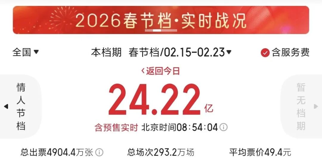 据猫眼专业版数据,截至2月19日8时54分,2026年春节档电影总票房(含预售)突破24.22亿元!《飞驰人生3》《惊蛰无声》《熊出没·年年有熊》分列前三位。