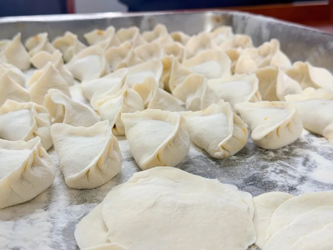 工人们一起包饺子。