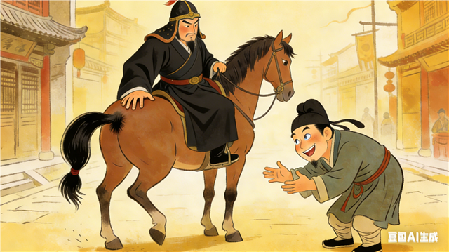 想象一下,当一位权贵或富人骑着马走来,某些趋炎附势之人为了讨好,根本不管那匹马是壮是瘦、是老是病,都会抢上前去,照例在马屁股上拍打一番,然后极尽夸张地赞美:“大人这匹马,真是世间少有的千里驹啊!”