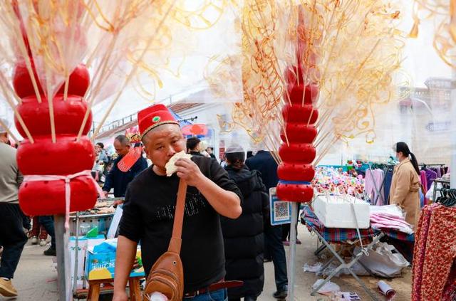 《出摊》:2025年3月1日,黄河大集上头戴官帽的小老板吃着简餐售卖着“甜蜜”。