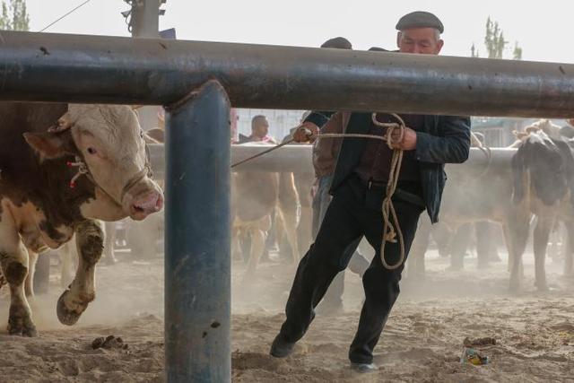 《巴扎上的“硬核拉扯”》:2025年10月19日, 在新疆牛羊巴扎的交易现场,牧民奋力拉住躁动的公牛。