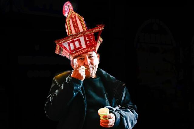 《戴花帽的维族老人》:2025年10月11日夜晚,在乌鲁木齐大巴扎遇见了一位头戴红纹彩饰花帽的老人,帽檐上的中国两字引人注目,他正惬意地品尝手中的小吃,大巴扎鲜活的夜生活就此定格。