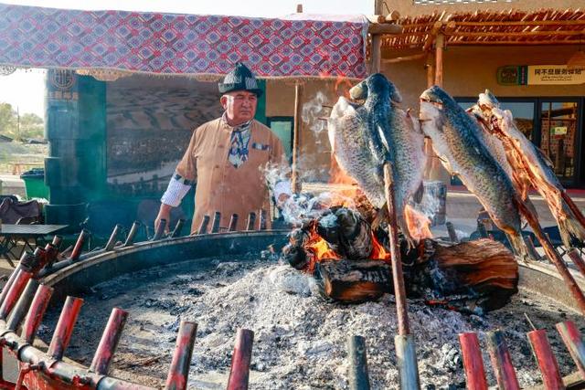 《罗布泊畔烤鱼香》:2025年10月12日,罗布人村寨的午后,篝火正旺,鲜鱼架在红柳枝上被烟火熏烤得滋滋冒香...