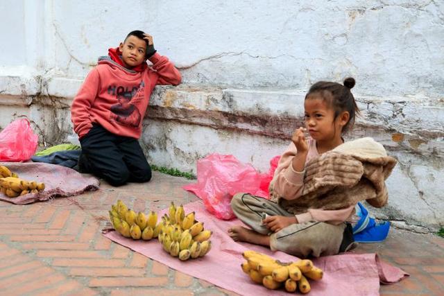《墙根下的童年》:2025年12月25日,老挝琅勃拉邦街头摆摊的孩子。