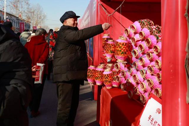 《手札灯笼里的红火年》:2025年2月9日,胡集书会开场,非遗及文创产品沿街有序铺开,手扎灯笼传承人张洪斌正在摊位上悬挂他亲手制作的灯笼。
