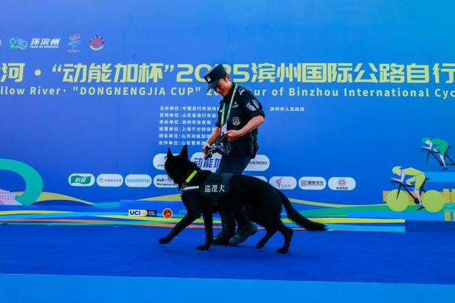 《走秀》:2025年9月9日,九九黄河·“动能加杯”2025滨州国际公路自行车赛在黄河三角洲交易中心鸣笛开赛。比赛结束,公安干警和他的”战友“从领奖台上走过。