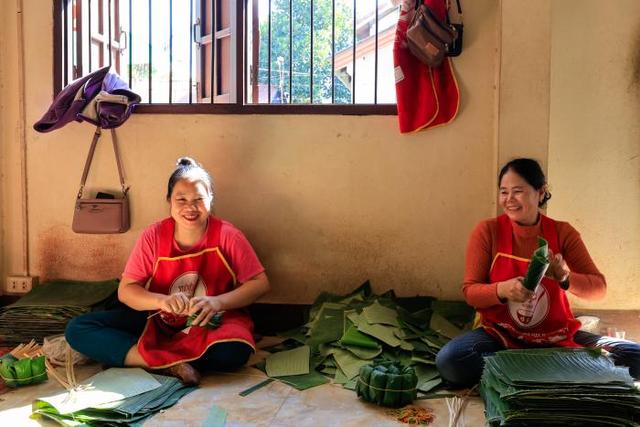 《制作特色美食“考姆”》:2025年12月25日,老挝妇女在作坊里制作考姆,它是老挝新年及日常节庆的必备食物。