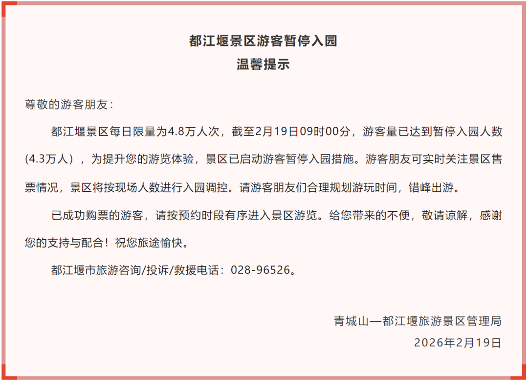 昨天(2月19日),多家景区发布公告启动限流措施: