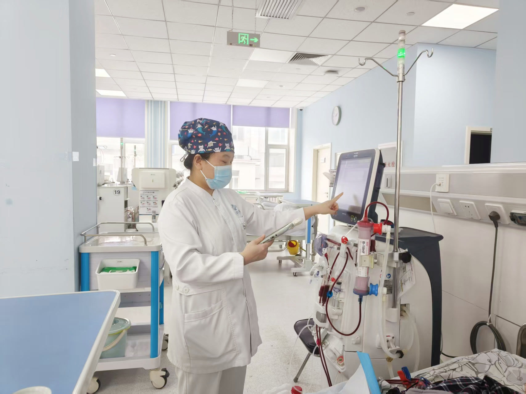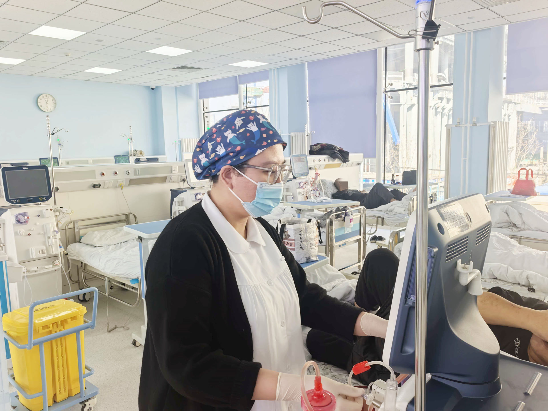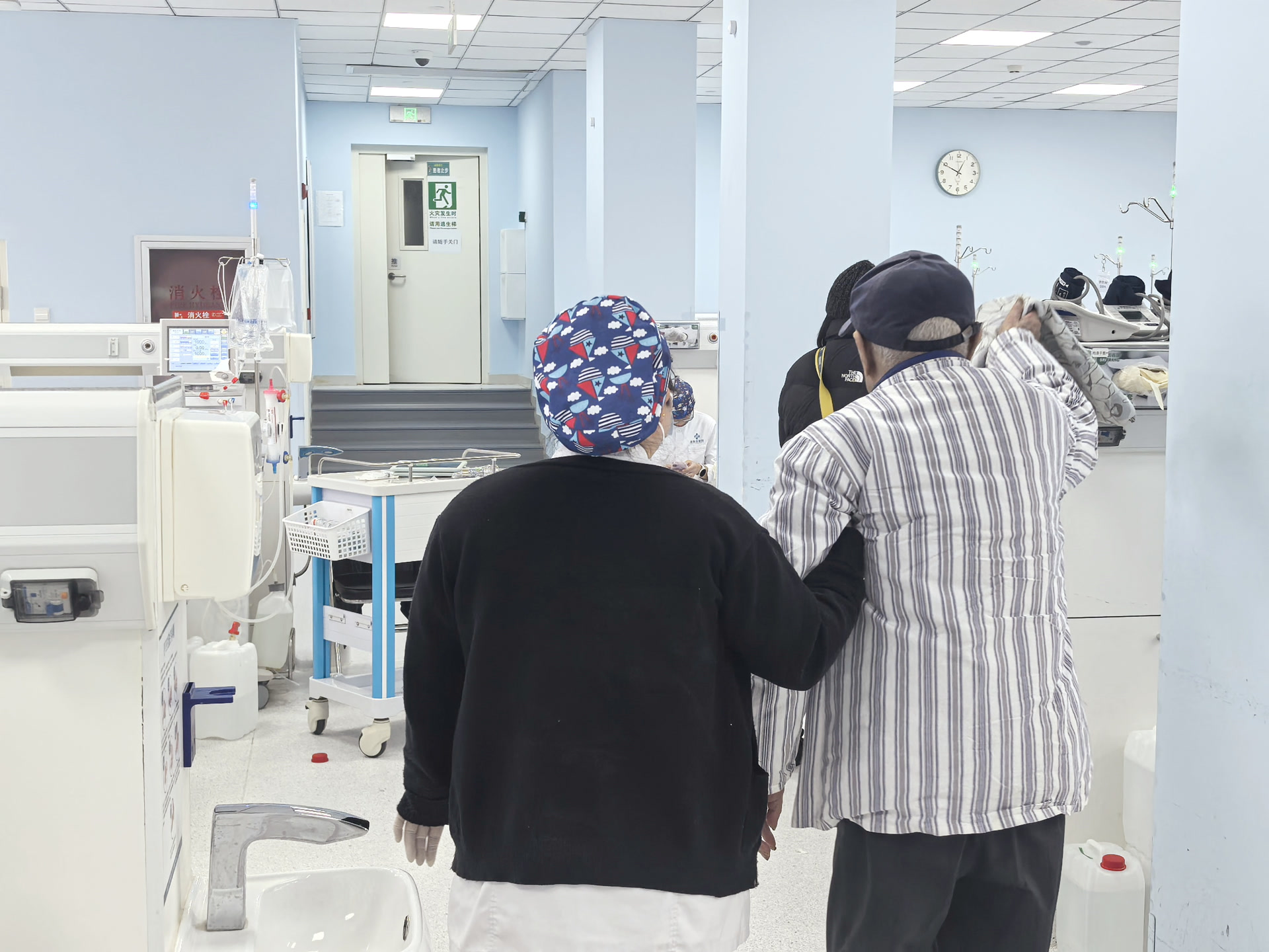 在这里,一天要接待100余名透析患者。面对如此庞大的工作量,医护人员始终保持着高度的专注和耐心。他们不断地在肾友机位前巡查,目光时刻关注着患者的状态,轻声询问患者的感受:“大爷,您现在感觉怎么样?有没有哪里不舒服?”“阿姨,要是有需要帮忙的地方,随时跟我说。”一句句温暖的话语,如同冬日里的暖阳,给患者带来安心与慰藉。