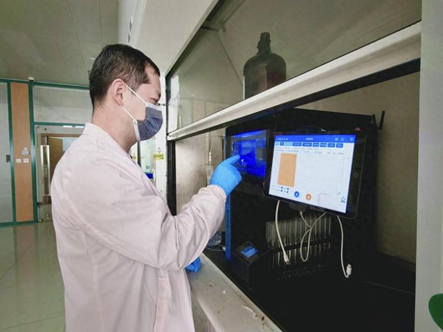 2月12日,石家庄四药集团药物研究院分析中心实验室,研发人员滑新星正操作油浴锅,加热实验样品。