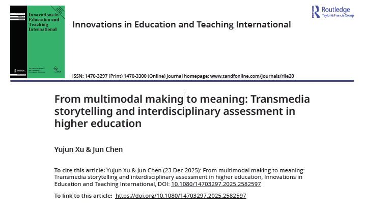2025年12月23日,浙江大学传媒与国际文化学院徐玉隽研究员与北京大学艺术学院教授陈均合作论文《从多模态创作到意义生成:跨媒介叙事与高等教育中的跨学科评价》(“From multimodal making to meaning: Transmedia storytelling and interdisciplinary assessment in higher education”)在《国际教育与教学创新》(Innovations in Education and Teaching International)发布。