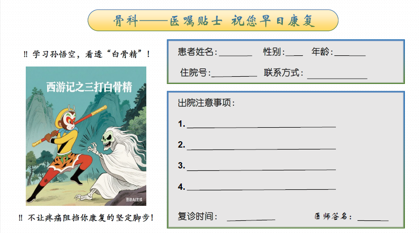 姜沐含是医学部临床医学专业的学生,作为医学生,她提交的期中作业是别致的“西游记”主题医嘱卡片和制作精美的“西游记”主题医学科普宣传手册。在医嘱卡和宣传册中,她将唐僧与孙悟空师徒四人西天取经、斩妖除魔的故事化作患者与各类病魔抗争的生动隐喻:“乌鸡国王被陷害后复活”的故事在宣传手册中对应着心肺复苏术在现实生活中让人起死回生的医学案例、师徒四人与白龙马的团队被描摹成各自发挥特色的多学科联合治疗团队……生动的卡通形象与严肃的医学知识相映成彰,对“西游记”作品的“切磋琢磨”也体现了创作者将传统文化IP与现代医学相融合的智慧丹心。