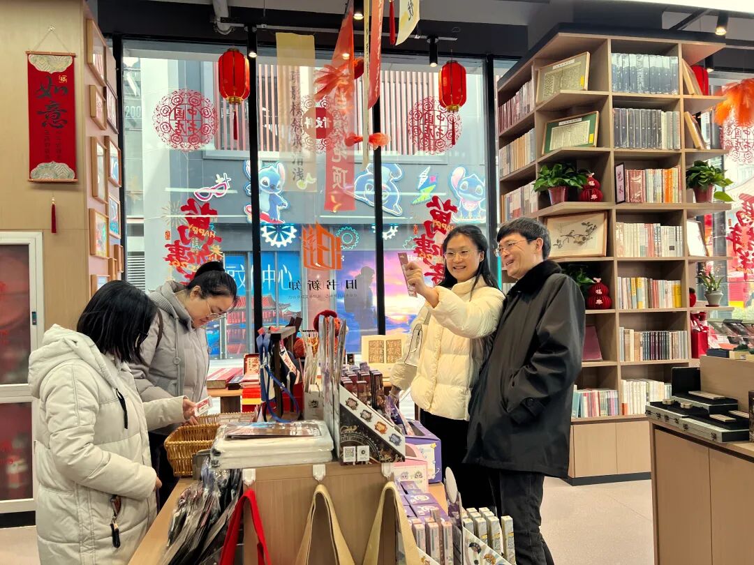 春节假期第一天上午10点,中国书店隆福寺店内已是熙熙攘攘。家长们带着孩子在书架间穿梭挑选图书,不少人驻足于“古籍之为艺术”特展前,认真聆听工作人员讲解明清珍本古籍的故事,从纸张、版刻、装帧中感受古籍的艺术之美。假期期间,书店推出的诗词大闯关活动备受欢迎,亲子组队参与诗词接句,闯关成功的市民拿着定制礼品,笑盈盈的脸上写满喜悦。店内的书籍与特色文创产品摆得满满当当,优惠活动进一步激发了市民的选购热情,一位带孩子前来购书的市民表示:“书店重装开业后我是第一次来,春节带孩子既能选书打卡,又能感受文化氛围,特别有意义。”