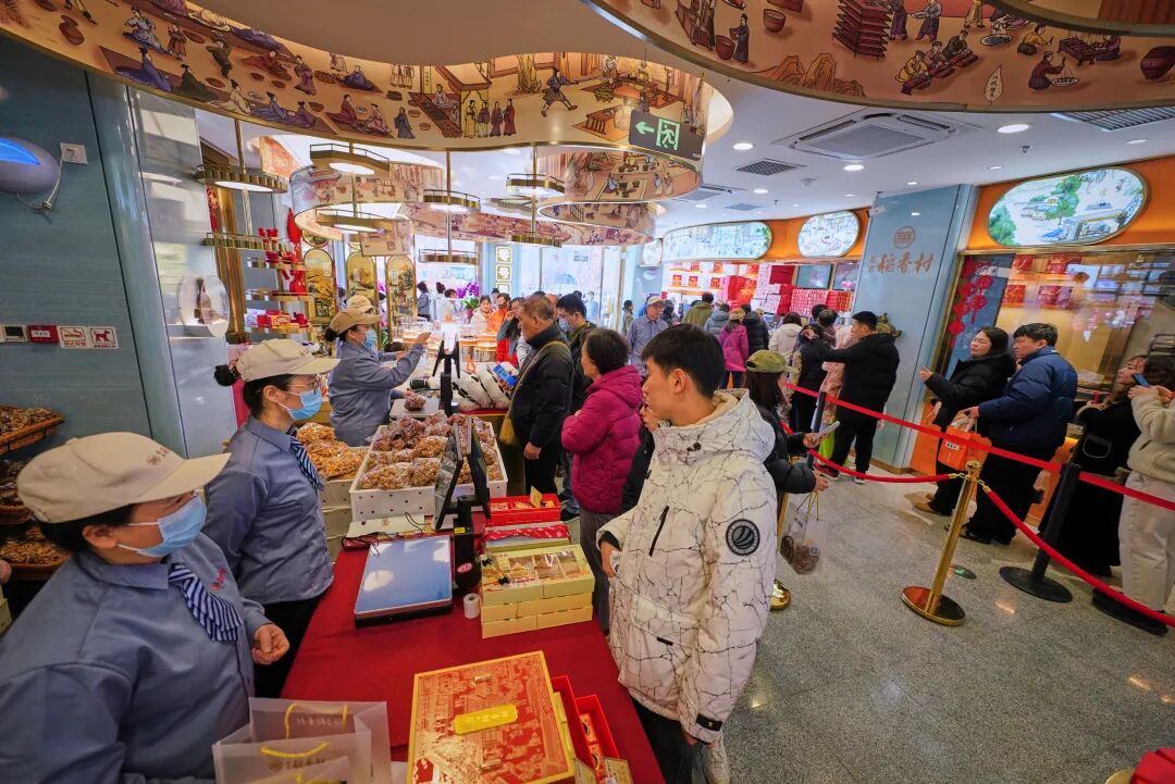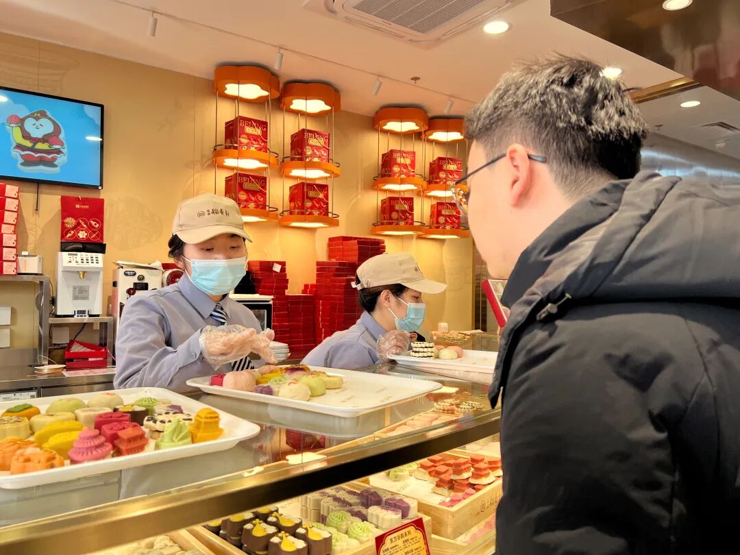 走出书店,北京稻香村隆福寺零号寻宝店内同样人气火爆。2月23日下午5点,春节假期最后一天,店内顾客依旧摩肩接踵,工作人员有序引导客流:“选购‘三件套’的顾客请在右手边排队,现烤糕点请到左侧……”现场不少市民游客纷纷打卡“总书记同款”糕点。据了解,节日期间店铺客流量是平日的两到三倍,最多的时候,三种年味小食一天销售三吨左右。来自黑龙江的姬女士这个假期已是第二次到访隆福寺街区,她开心展示着选购的糕点,“年前就来买过蜜三刀、奶油麻花、开花枣总书记同款的‘三件套’,这不马上要回家,特意再来一趟,带点糕点给家人尝尝。”