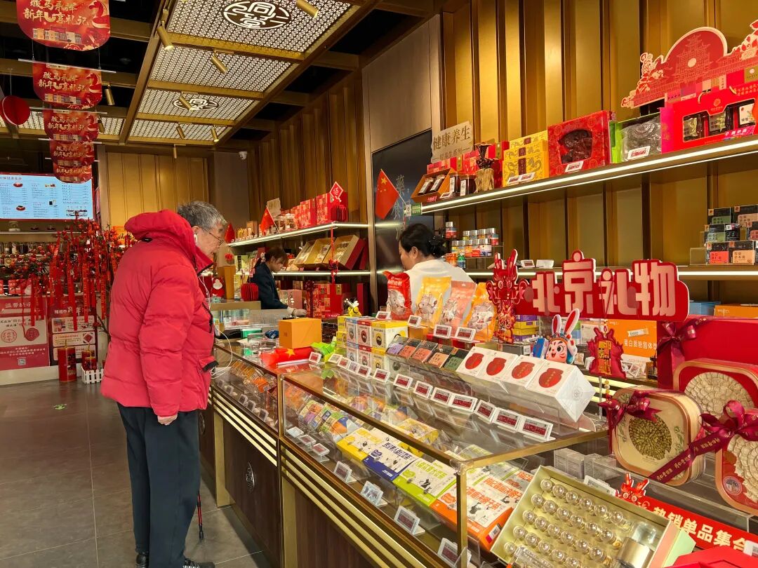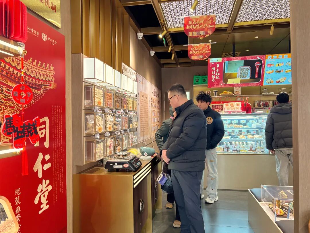 步入同仁堂隆福寺店,进门便能看到挂满福袋的祈福树,红彤彤的福袋随风轻晃,年味十足。不少市民在此系上福袋,许下新春美好心愿。柜台前,顾客们认真挑选着滋补品礼盒、草本茶等好物,工作人员耐心讲解养生知识,为市民推荐适合新春的养生佳品。市民马先生一手端着托盘,一手挑选了一个黑芝麻碱水面包和一个陈皮肉桂苹果派,“现在大家都讲究养生,我也尝尝。”近年来,随着健康消费持续升温,同仁堂特色产品愈发受到市民青睐。今年春节假期,同仁堂隆福寺店客流同比增长三成。