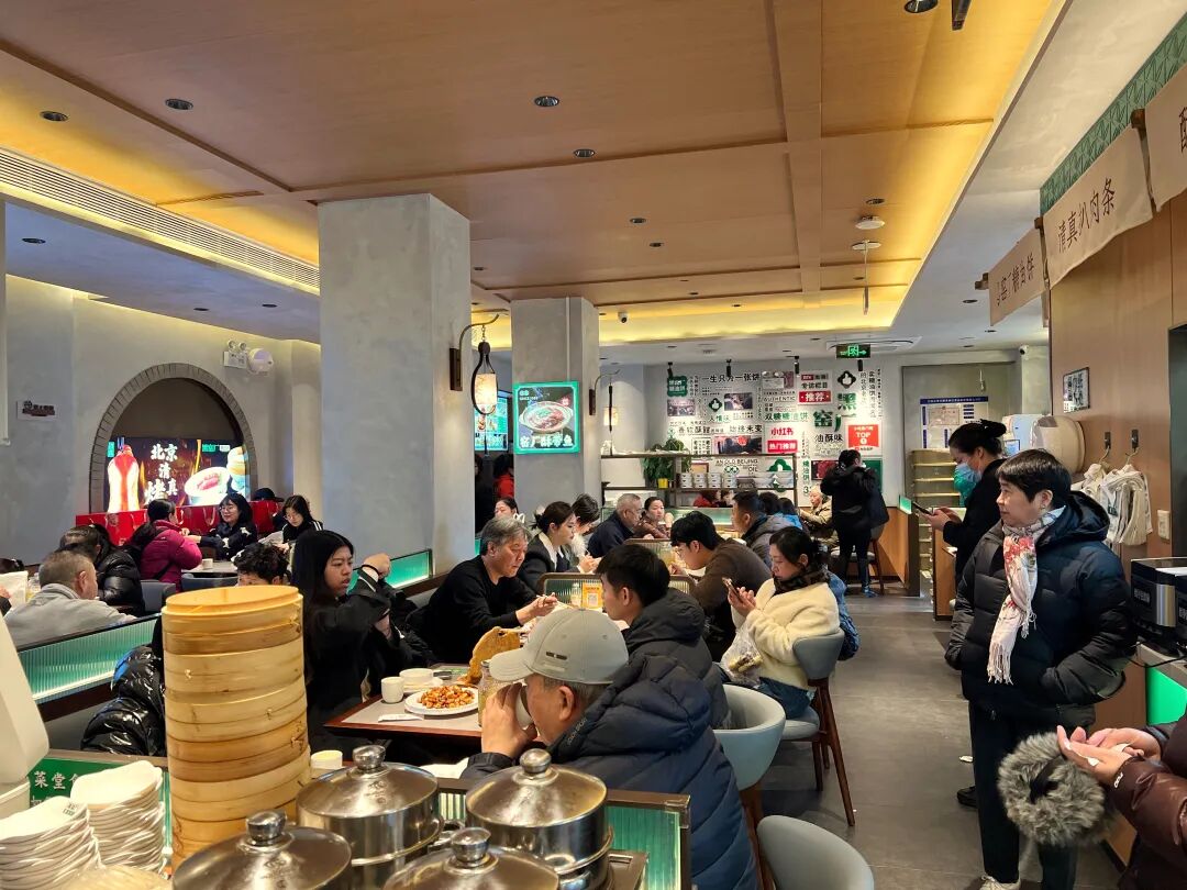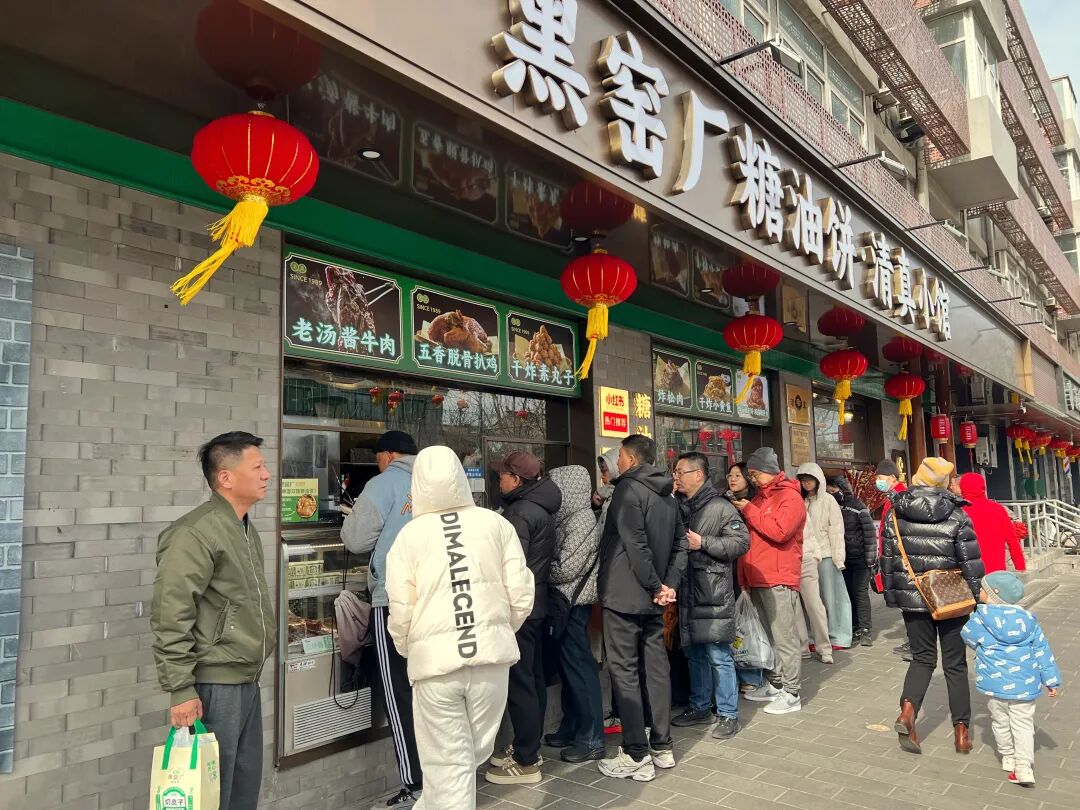 位于街区东侧入口的黑窑厂糖油饼店前,食客排起长队。刚出锅的糖油饼热气腾腾,焦香酥脆的烤鸭、地道老北京卤煮香气四溢,勾人味蕾。窗口店员熟练打包、快速出餐,便捷即取的模式让游客轻松品尝地道美食。不少市民全家出动,手拿糖油饼边走边吃,脸上尽是满足。市民汪女士说:“这家店干净正宗,春节特意带父母孩子来,感受原汁原味的老北京味道。”不远处的好饭餐厅内,暖黄的灯光下,食客们围坐餐桌,品尝着拌饭与特色主食,市井烟火气温暖人心。