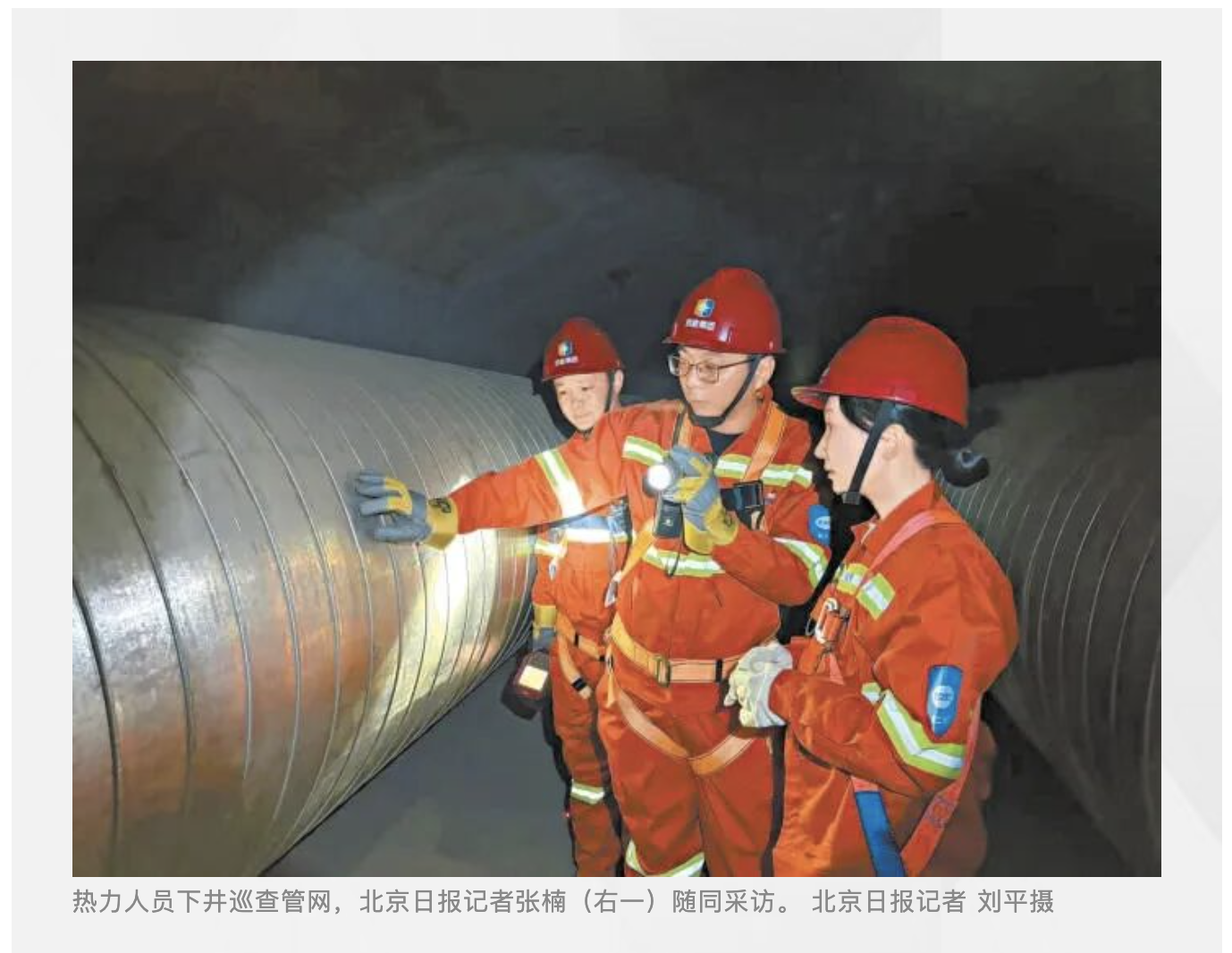 井下的世界与地上截然不同。巨大的供热管道在黑暗中静静延伸向远方,手电筒的光柱只能照清前方几米的范围。从接近零摄氏度的地面乍一进入地下,不一会儿,记者已感到闷热难耐。周桐解释,井下因热力管道散热,温度常常达到40摄氏度左右。寒冷的冬季,井下和地面的温差有时足足能相差50摄氏度。而这一冷一热的极致转换,正是“管线医生”的工作常态。