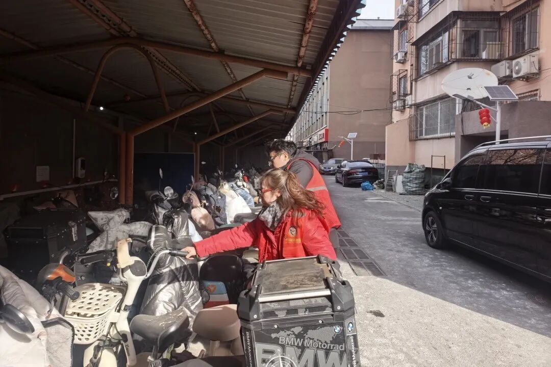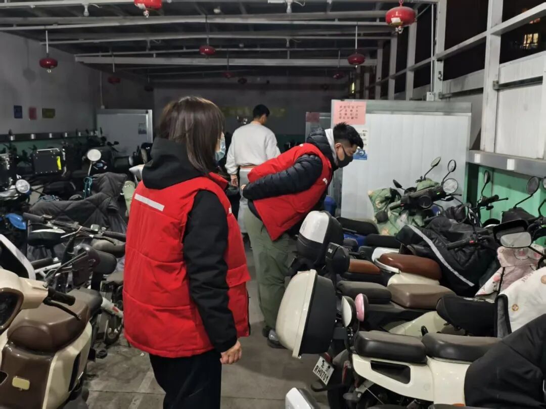 春节期间,安全弦不能松。刘洁与同事康庆浩一起走进社区电动自行车棚,逐一检查灭火器压力值是否正常、消防器材数量是否齐全、是否都在有效期内……确认所有设施完好可用后,刘洁第一时间拨通了物业负责人的电话:“消防器材都检查了,没问题。但日常管理还得盯紧,定期巡查不能松。”