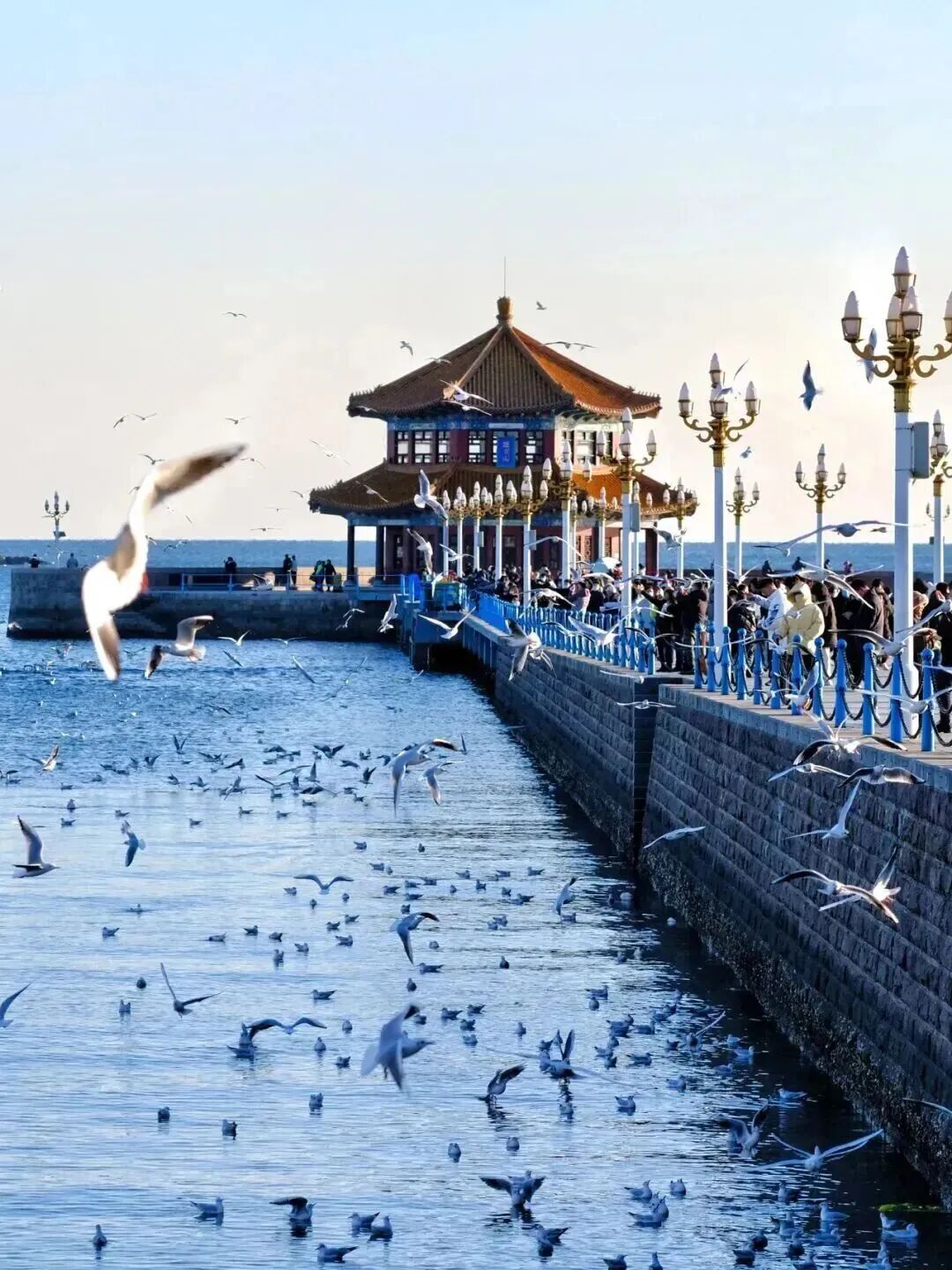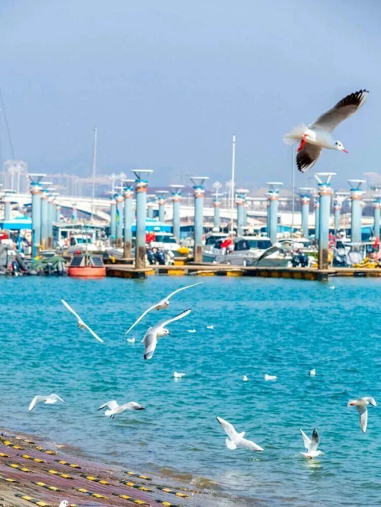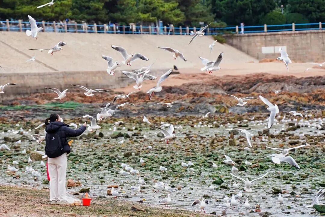 栈桥是观鸥首选,11月下旬起便进入最佳观赏期,成群红嘴鸥在碧蓝海面盘旋,与百年栈桥相映成趣,栈桥上的“鸥啦餐车”和1元鸥粮面包,让投喂互动更便捷安全。