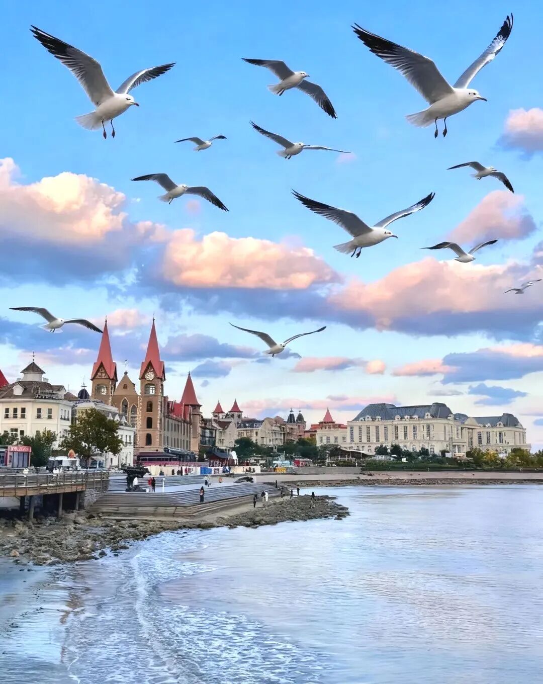 幸福门广场作为城市地标,开阔的海岸线让海鸥飞行轨迹与城市景观完美融合,漫步观景步道,既能欣赏威海湾全景,又能与身边的海鸥亲密互动。