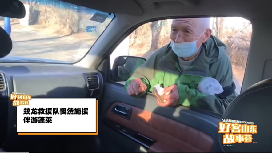 在一个突然降温的寒冷冬日,蓬莱蛟龙救援队队长薛宪波和两名队员驾车在国道行驶时,发现了一位穿着单薄、背着双肩包的老人,他们立刻将老人扶上车,开启暖风为他驱寒。