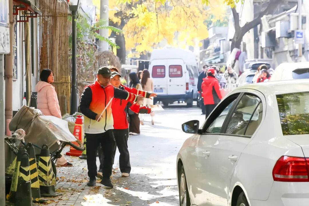 “请您把车停北口,走两步就能看到最美的银杏!”深秋时节,“甜葡萄志愿者”们热情引导着游客。这支由居民、商户和文明引导员组成的队伍,经街道培训后上岗,不仅维护秩序,还提供问路、急救等服务。