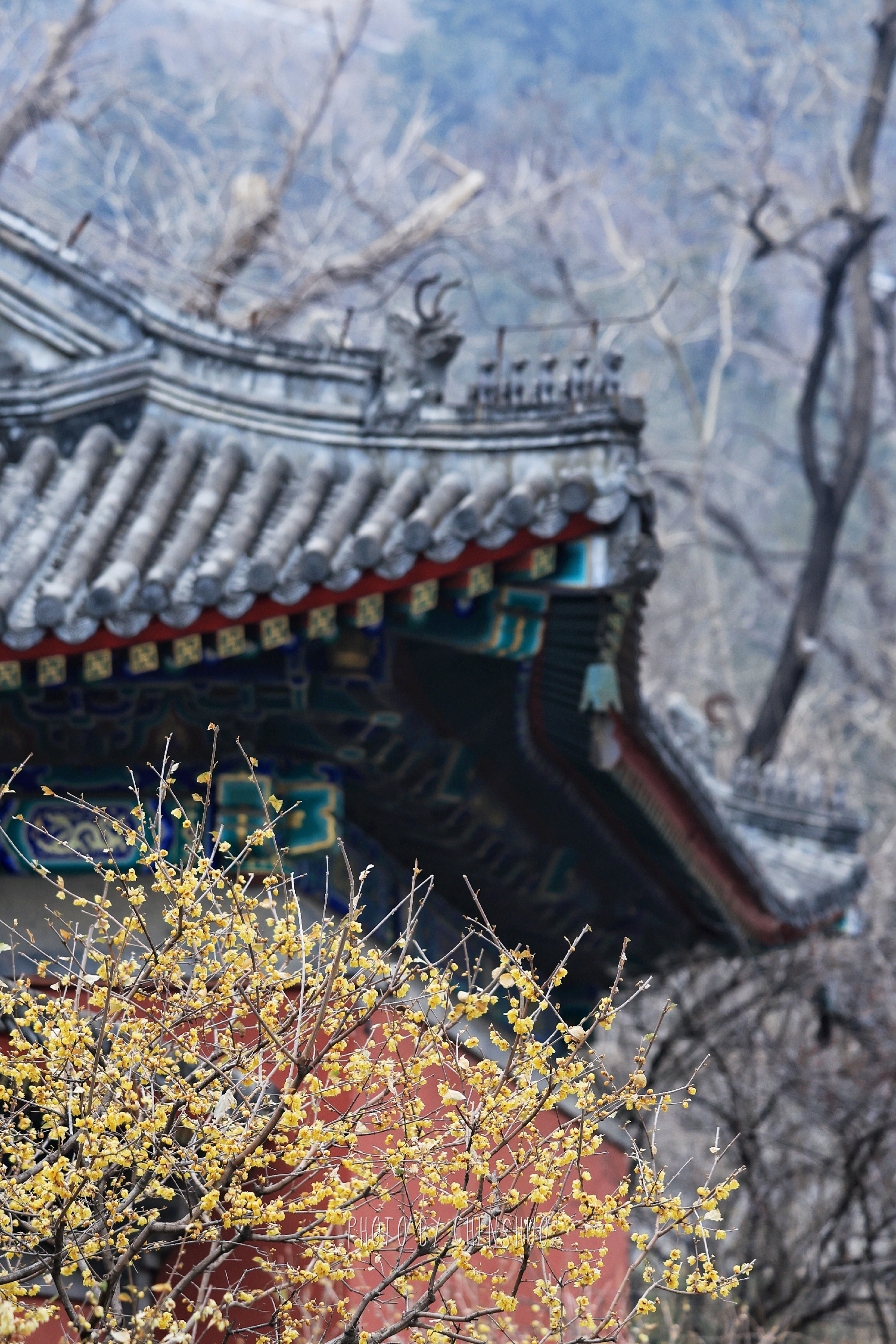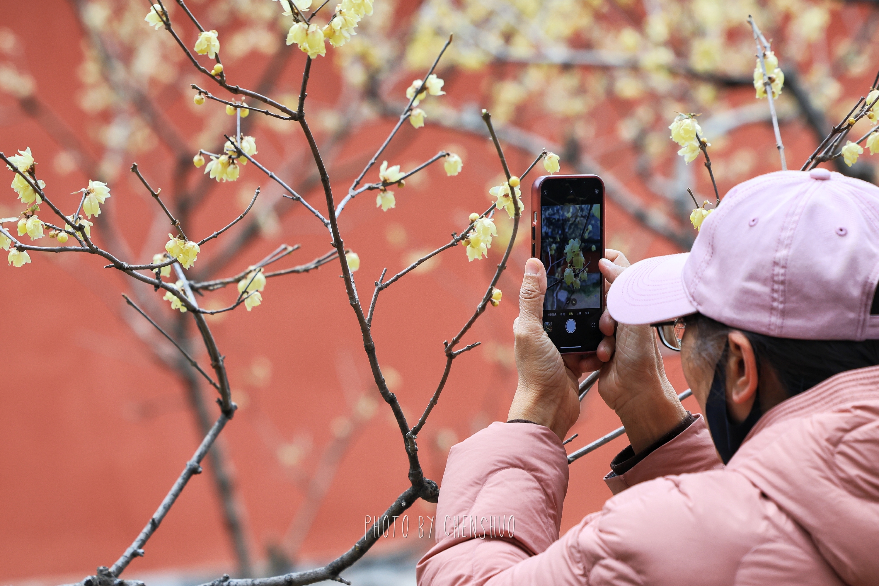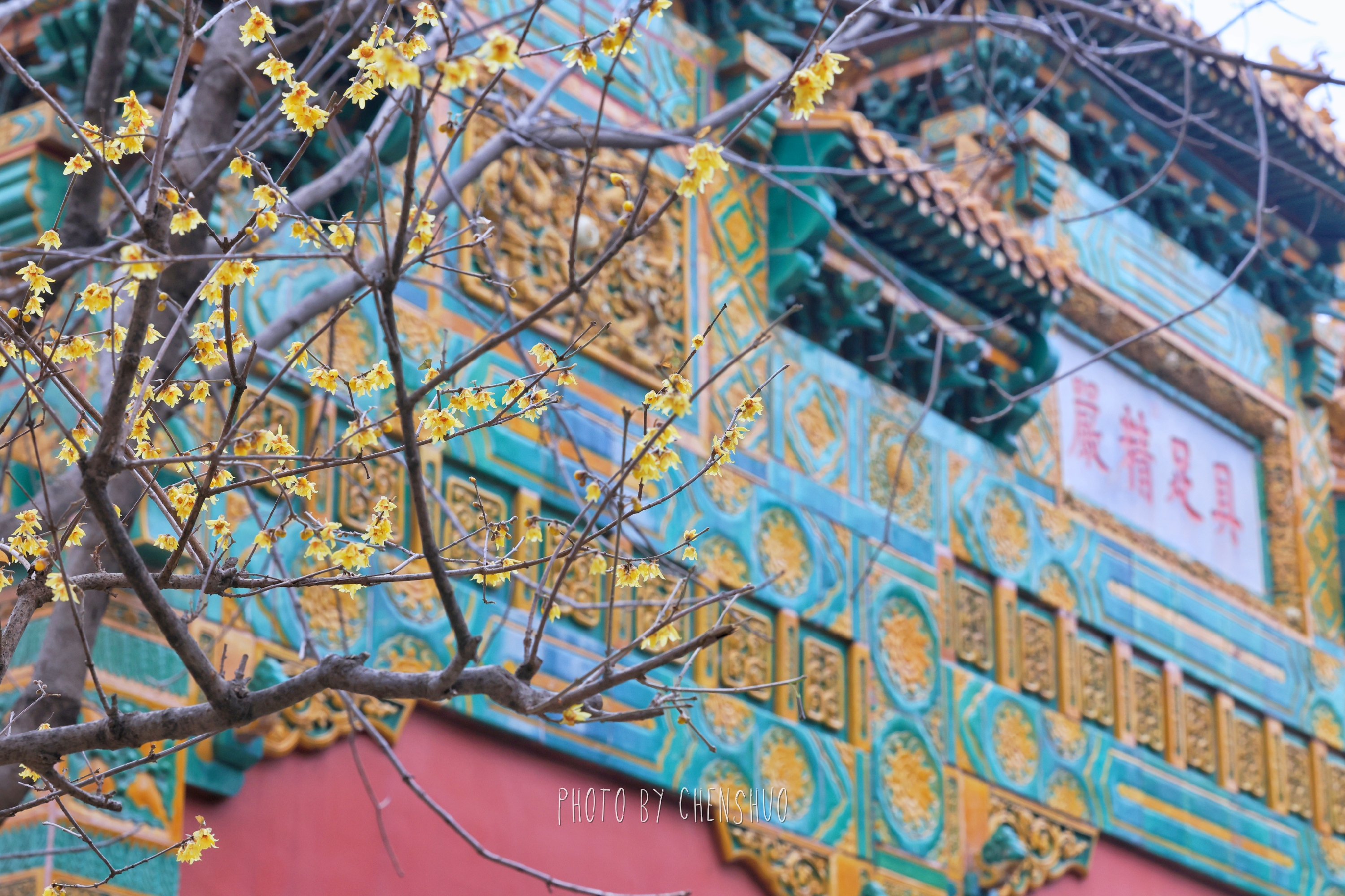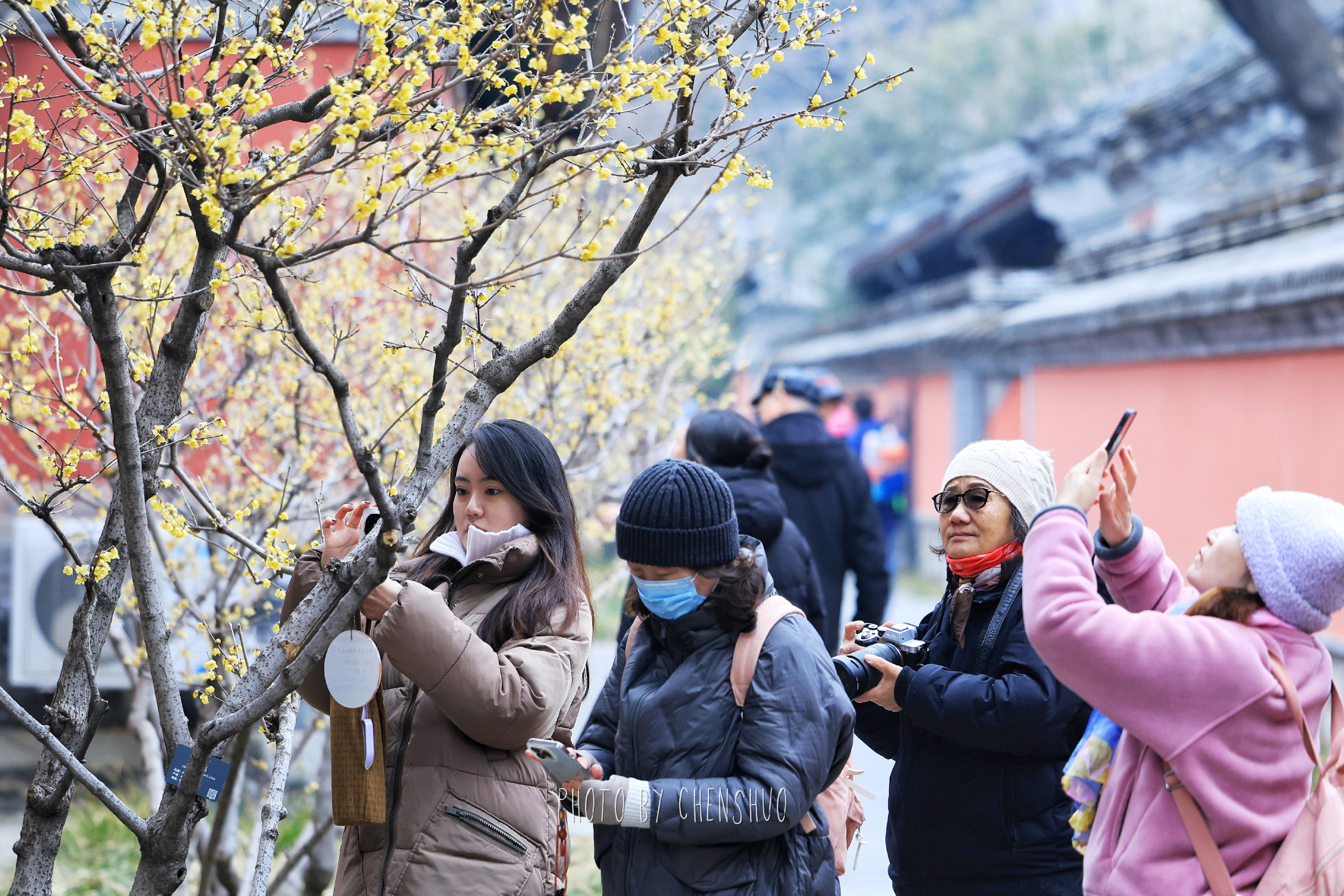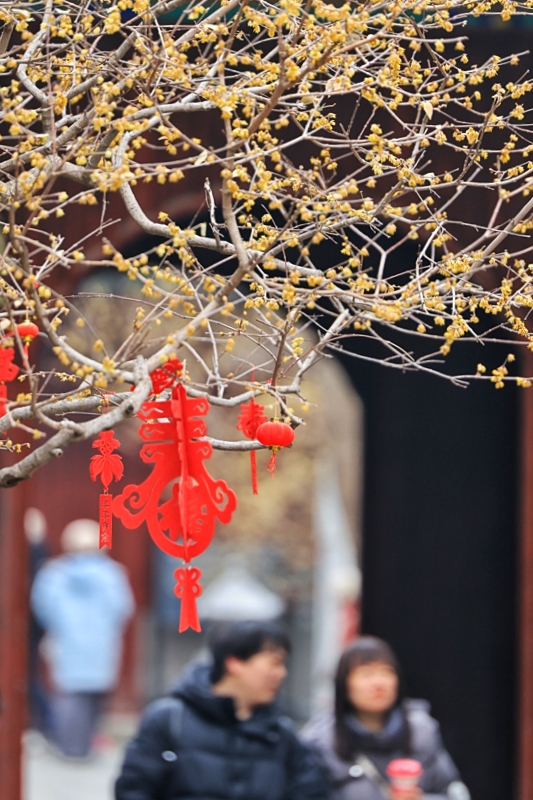 漫步古寺之中,莹润蜡黄的花瓣,与红墙黛瓦、飞檐古建相映成趣。一古一雅,一动一静,勾勒出独属于中式美学的诗意画面。微风拂过,清甜馥郁的香气扑面而来,不用刻意寻找,鼻尖早已被这抹早春限定的芬芳包裹,引得无数游人驻足拍照,定格这份难得的禅意与浪漫。