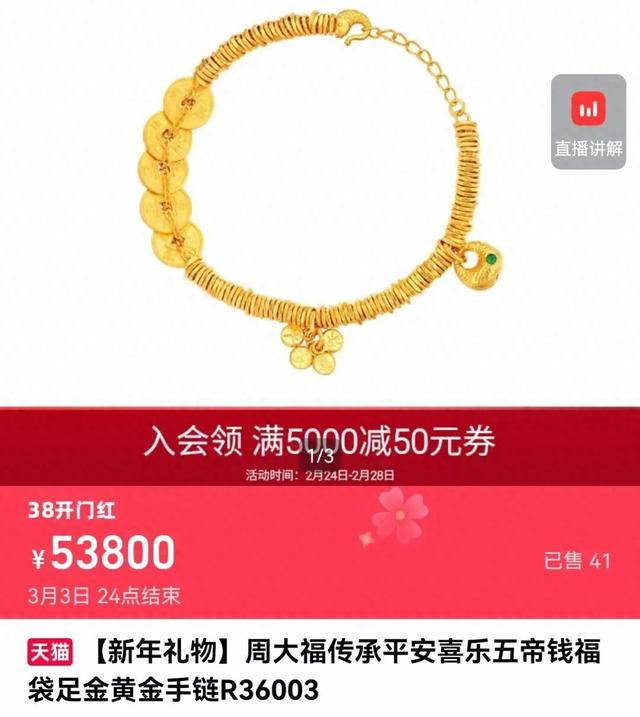 2月24日,北京京西大悦城周大福门店销售向中新经纬确认了涨价消息,该销售表示:“涨价时间在3月10日左右。一条克重在29.88克的五帝钱金手链涨价前53800元,即将涨价到71800元,目前是一货难求。”据此计算,该条手链涨幅超33%,涨价后克均价已超2400元。