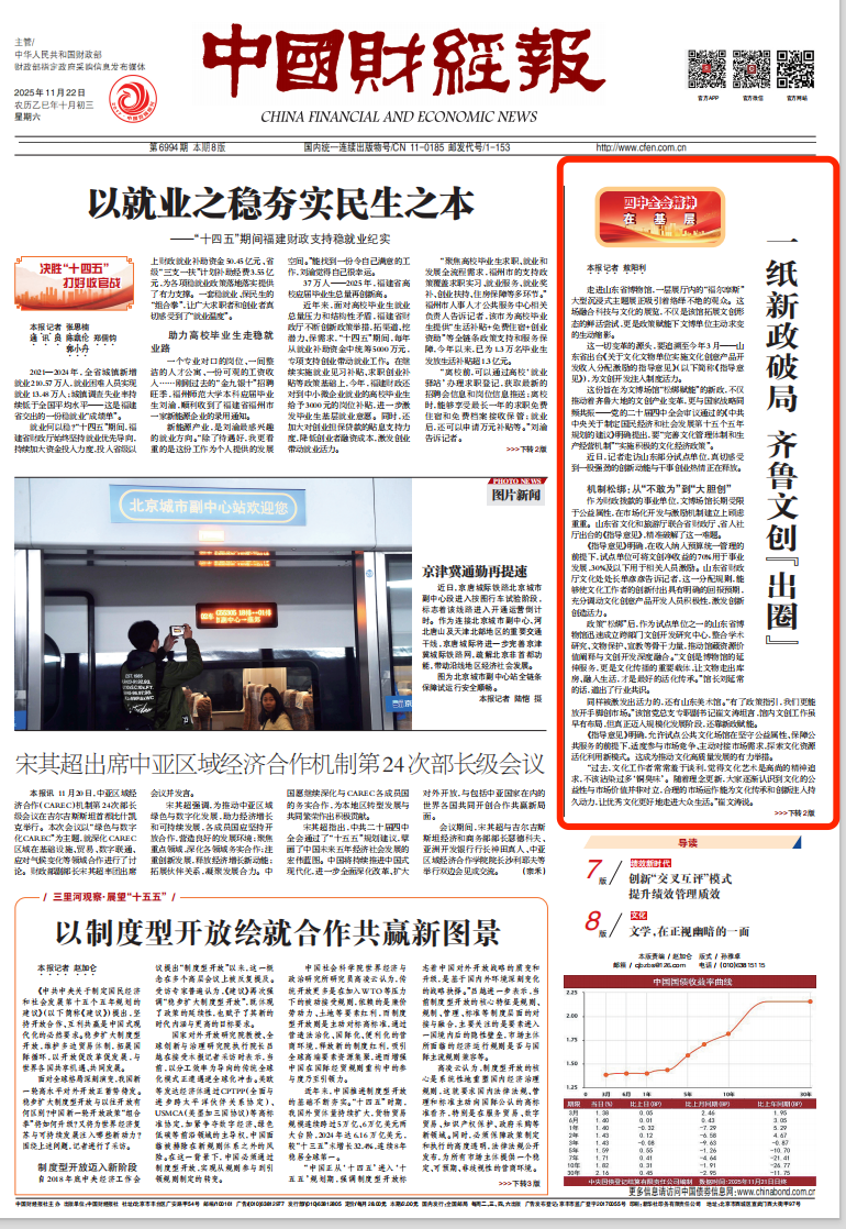 《中国财经报》头版刊文《一纸新政破局 齐鲁文创“出圈”》,全文如下: