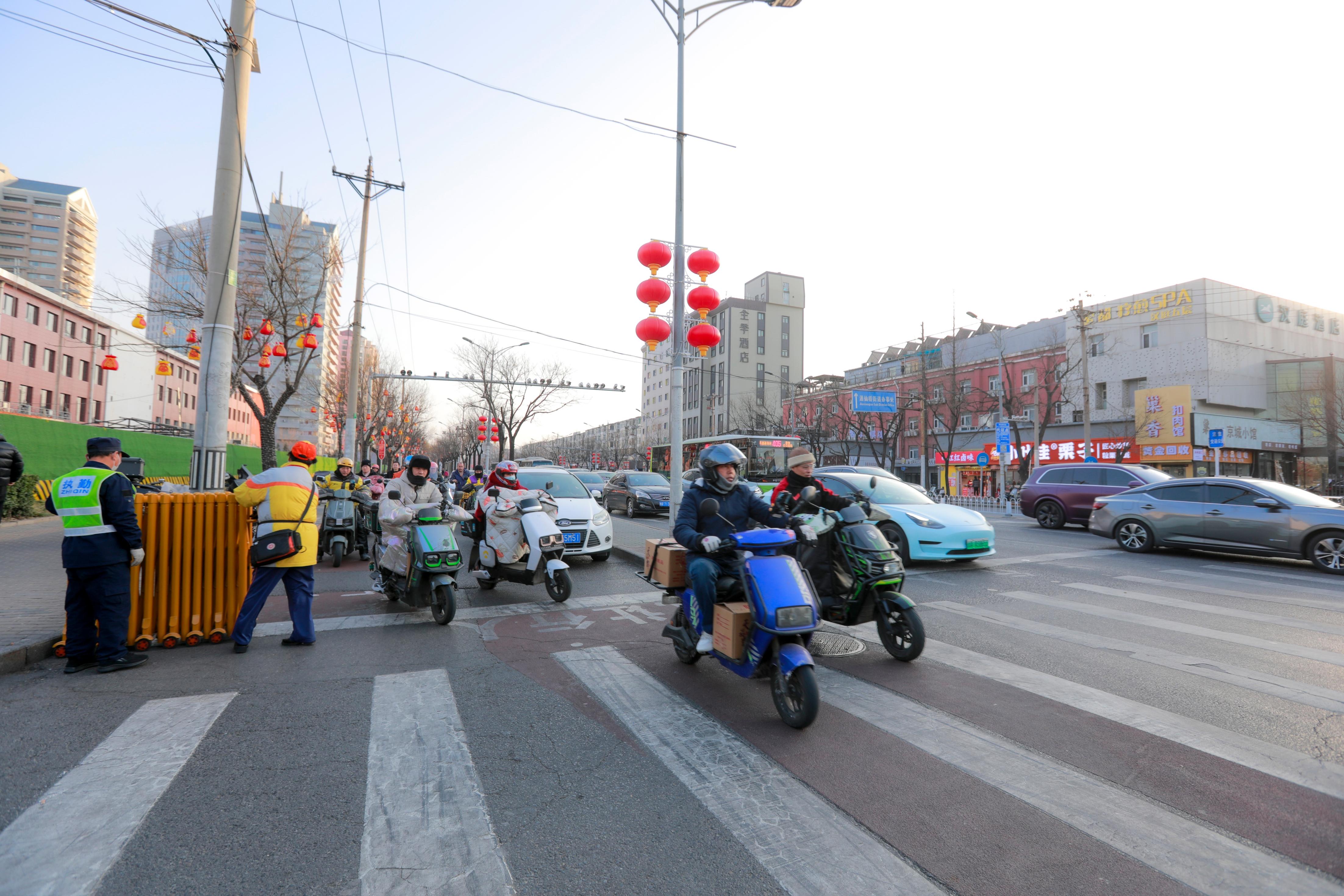 联合执法精准化:街道平安建设办公室联合朝阳交通支队机场交通大队,定期开展违停整治行动,利用智能执法设备拦截非机动车、引导二次等灯非机动车规范排队等,实现精准执法,同时,街道在早晚高峰时段安排专人在路口值守,有效维护了道路交通秩序。