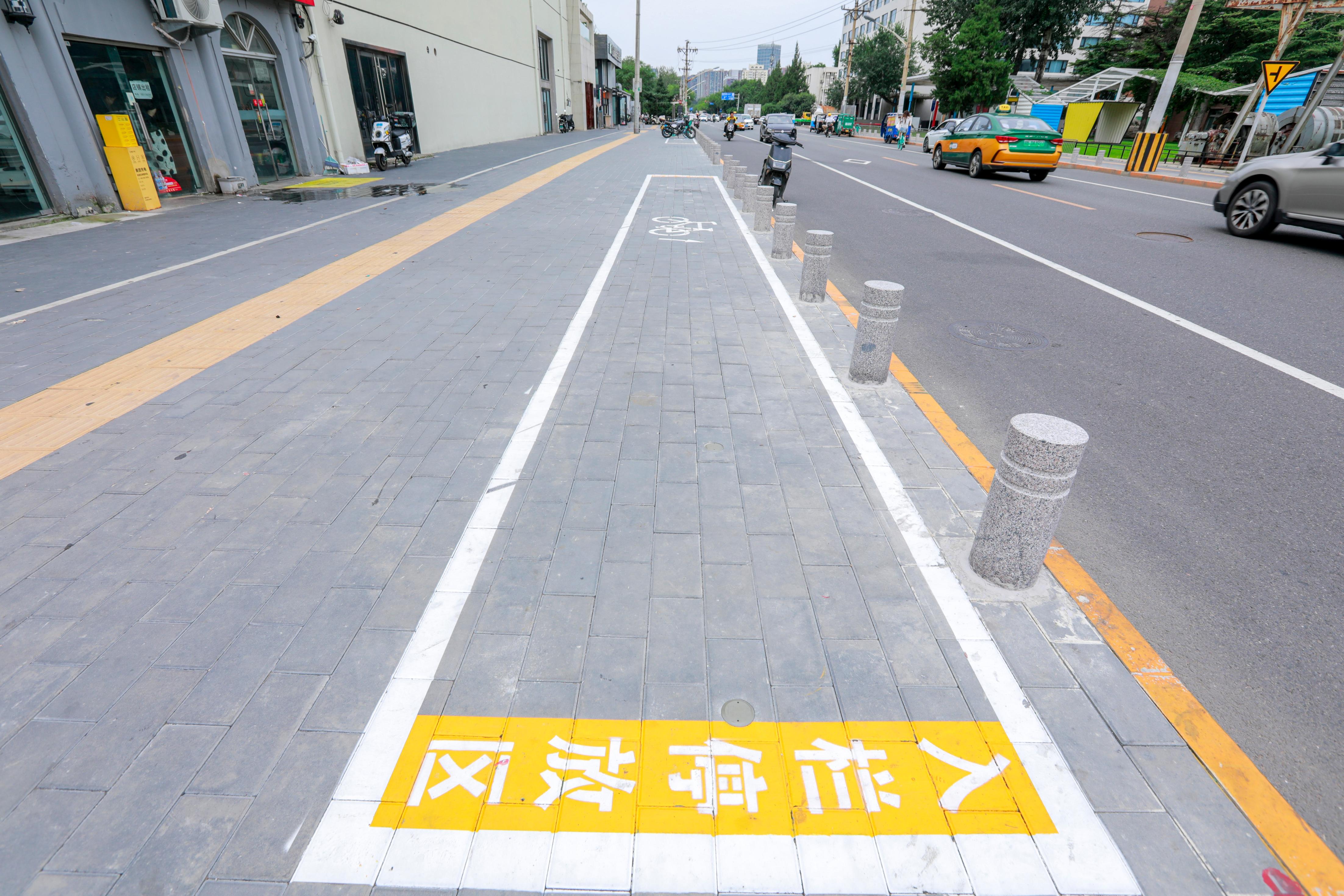 慢行系统优化升级:在酒仙桥北部片区,街道引入电子围栏技术,在共享单车区域聚集的各条干路启用“蓝牙道钉嗅探”,施划停放区域1362延米,新增设道钉1130个,增设嗅探39个,通过科技手段规范单车停放,提升区域交通品质。酒仙桥北路通过绿化带微调,将人行道从0.9米拓宽至2米,为行人提供更舒适的出行环境。