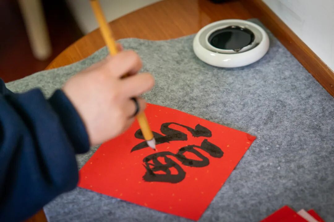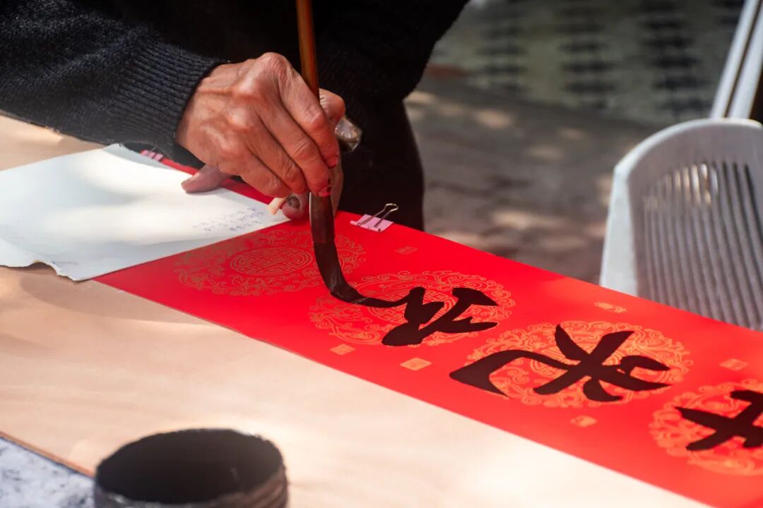 研墨铺纸,提笔落笔。一个“福”字藏着千百种写法——正着贴是迎福进门,倒着贴是福气已到。再配上工整春联,上联下联平仄相对,横批高悬正中。