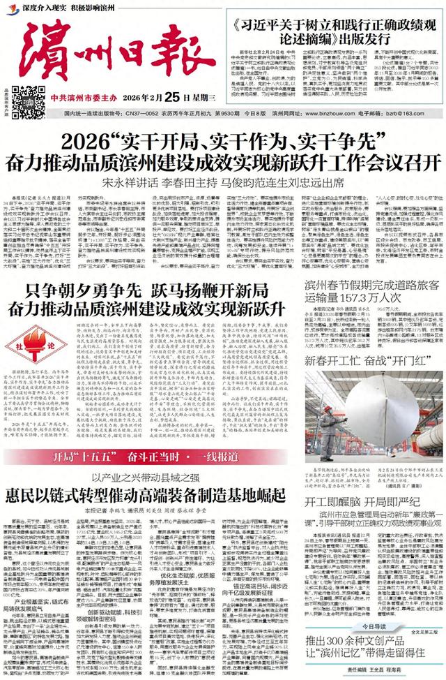滨州日报/滨州网讯2月24日下午,2026“实干开局、实干作为、实干争先”奋力推动品质滨州建设成效实现新跃升工作会议召开。会议以习近平新时代中国特色社会主义思想为指导,深入贯彻党的二十大和二十届历次全会精神,全面贯彻落实习近平总书记视察山东重要讲话和重要指示批示精神,落实全省干事创业担当尽责确保“十五五”开好局工作会议精神,动员全市上下实干开局、实干作为、实干争先,打好“三大战役”,实施“三大行动”,优化“三大环境”,奋力推动品质滨州建设成效实现新跃升。