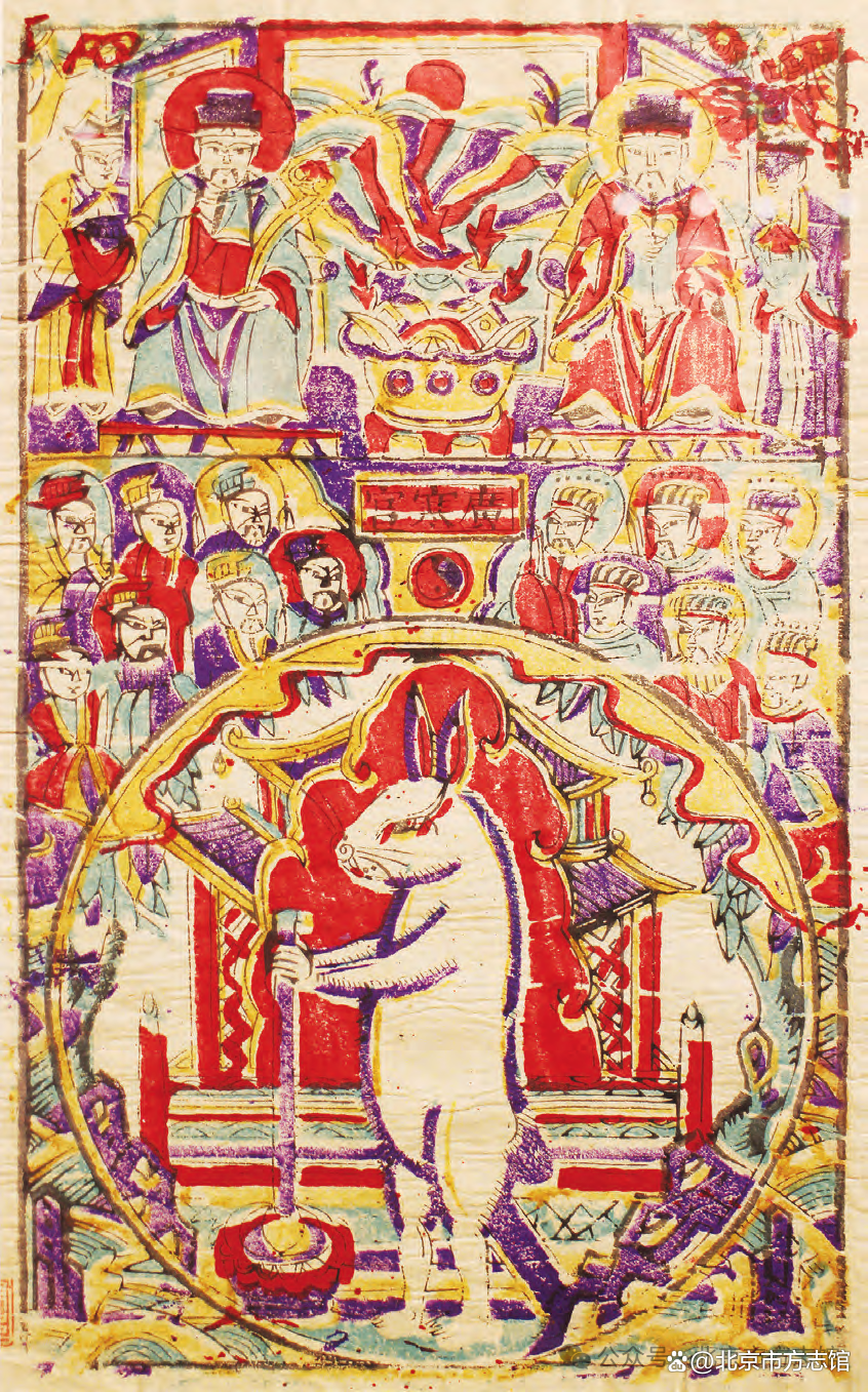 当烽烟渐熄,马的形象从沙场走入寻常街巷,融入岁时节令,成为百姓祈福迎祥的生动载体。明代刘侗、于奕正所著《帝京景物略》,就详细记载了中秋使用月光马的民俗:“纸肆市月光纸绘满月像,趺坐莲华者,月光遍照菩萨也。华下月轮桂殿,有兔杵而人立,捣药臼中。”月光马是中秋专用的祭月纸马。