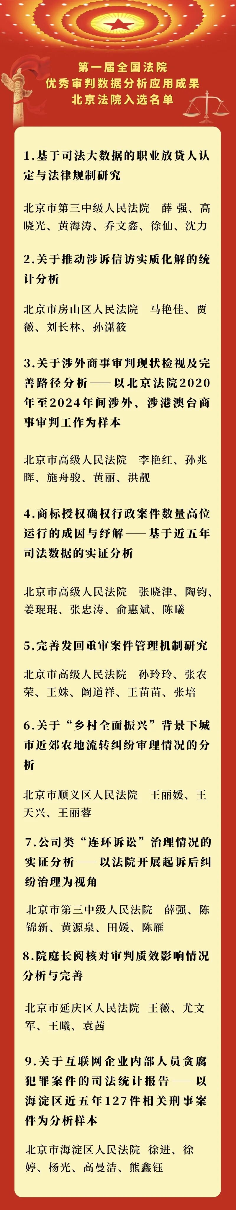 为强化符合司法规律的审判管理,切实提升全国各级法院司法审判数据分析能力和应用水平,2025年最高人民法院组织开展第一届全国法院优秀审判数据分析应用成果评选活动。近日,最高人民法院发布《关于第一届全国法院优秀审判数据分析应用成果评选结果的通报》,从各高级人民法院推荐参评成果458篇中评选出优秀成果60篇。北京法院共有9篇成果获评优秀,获奖数量居全国法院首位。