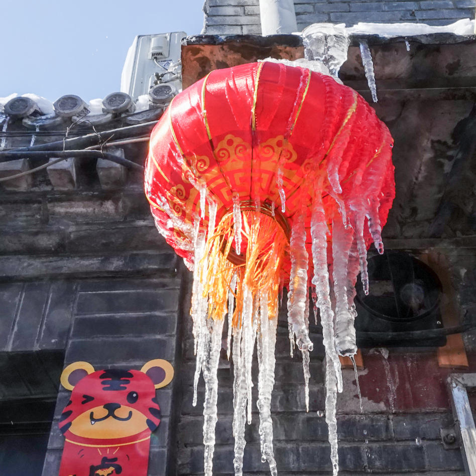 冰棱与红灯笼:冰棱垂在灯笼下,冷与暖撞出了年的味道。