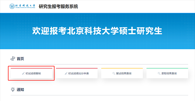 1.我校硕士研究生初试成绩公布前已经过多次严格复核。根据上级招生主管部门的安排,若考生对成绩仍有疑问的,可于2026年3月2日8:00-3月3日22:00之间登录“北京科技大学研究生报考服务系统”( https://yjsy.ustb.edu.cn/ksxt/logon),选择“2026年硕士研究生复试录取”选项进入系统,选择“初试成绩复核”,提交成绩复核申请(提示:一旦提交不允许修改,请谨慎、详细填写申请复查的具体内容和理由),逾期不再受理。我校将组织专人进行复核。