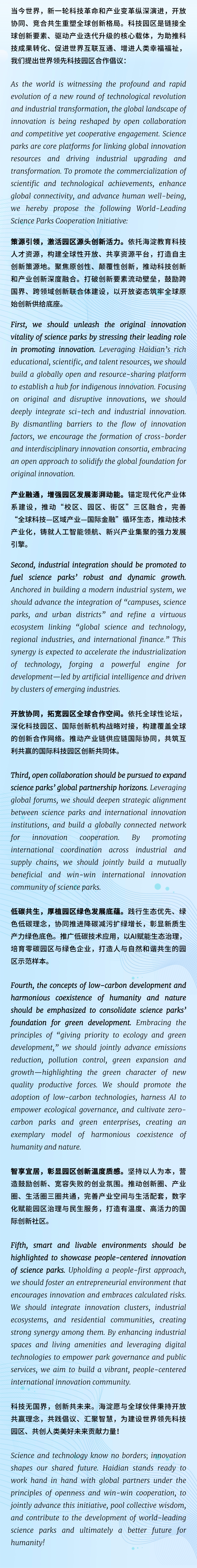《合作倡议》为助推科技成果转化、促进世界互联互通、增进人类幸福福祉,立足全球创新格局,从策源引领,激活园区源头创新活力;产业融通,增强园区发展澎湃动能;开放协同,拓宽园区全球合作空间;低碳共生,厚植园区绿色发展底蕴;智享宜居,彰显园区创新温度质感五个维度,呼吁全球科技园区携手共进,打破创新要素流动壁垒,鼓励跨国界、跨领域创新联合体建设,以开放姿态筑牢全球原始创新供给底座,为建设世界领先科技园区、共创人类美好未来贡献力量。