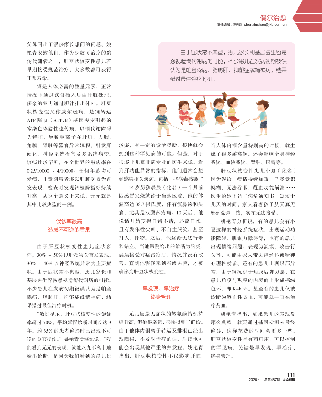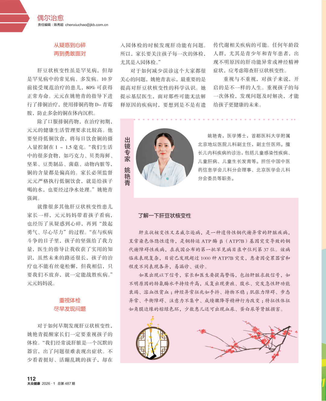 对于如何早期发现肝豆状核变性,姚艳青提醒家长们一定要重视孩子的体检。“我们经常说肝脏是一个沉默的器官,出了问题很难表现出症状。不少看着挺好、活蹦乱跳的孩子,却在入园体检的时候发现肝功能有问题。所以,家长要关注孩子每一次的体检,尤其是入园体检。”