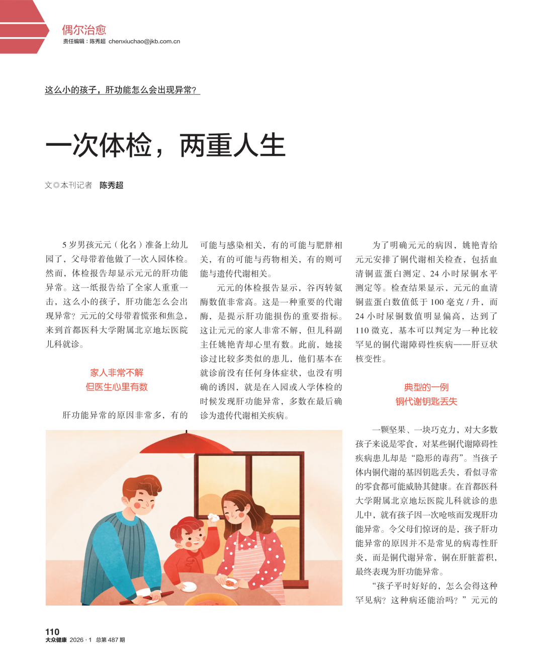 一颗坚果、一块巧克力,对大多数孩子来说是零食,对某些铜代谢障碍性疾病患儿却是“隐形的毒药”。当孩子体内铜代谢的基因钥匙丢失,看似寻常的零食都可能威胁其健康。在首都医科大学附属北京地坛医院儿科就诊的患儿中,就有孩子因一次呛咳而发现肝功能异常。令父母们惊讶的是,孩子肝功能异常的原因并不是常见的病毒性肝炎,而是铜代谢异常,铜在肝脏蓄积,最终表现为肝功能异常。
