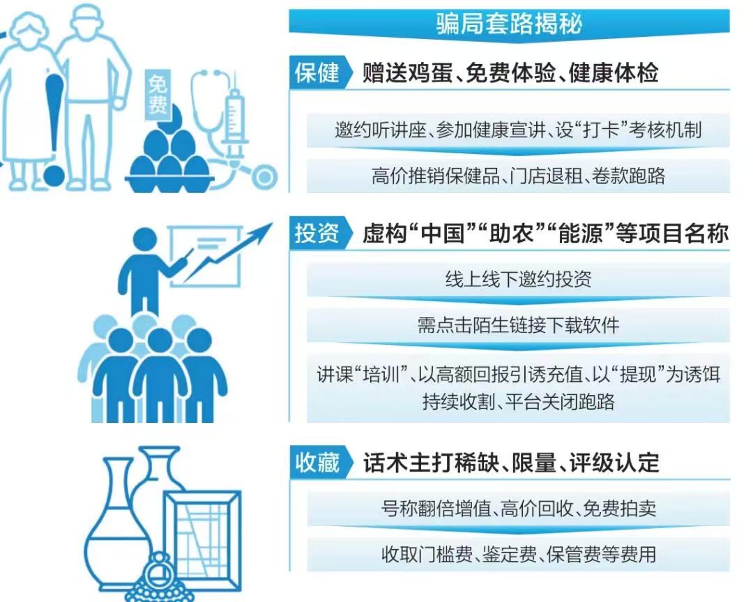 “线上线下的保健品和收藏品营销,以对老人虚假宣传、诱导消费的居多。”北京市公安局通州分局刑侦支队民警介绍,真正涉嫌违法犯罪的相对较少。收藏品套路背后,往往会跟着拍卖骗局,骗取受害者的手续费、拍卖费等,这种骗局就涉嫌违法犯罪。所谓项目投资等,则是一种常见的网络骗局,这类投资平台或网站软件,由于后台服务器通常在海外,其追查工作难度很大。