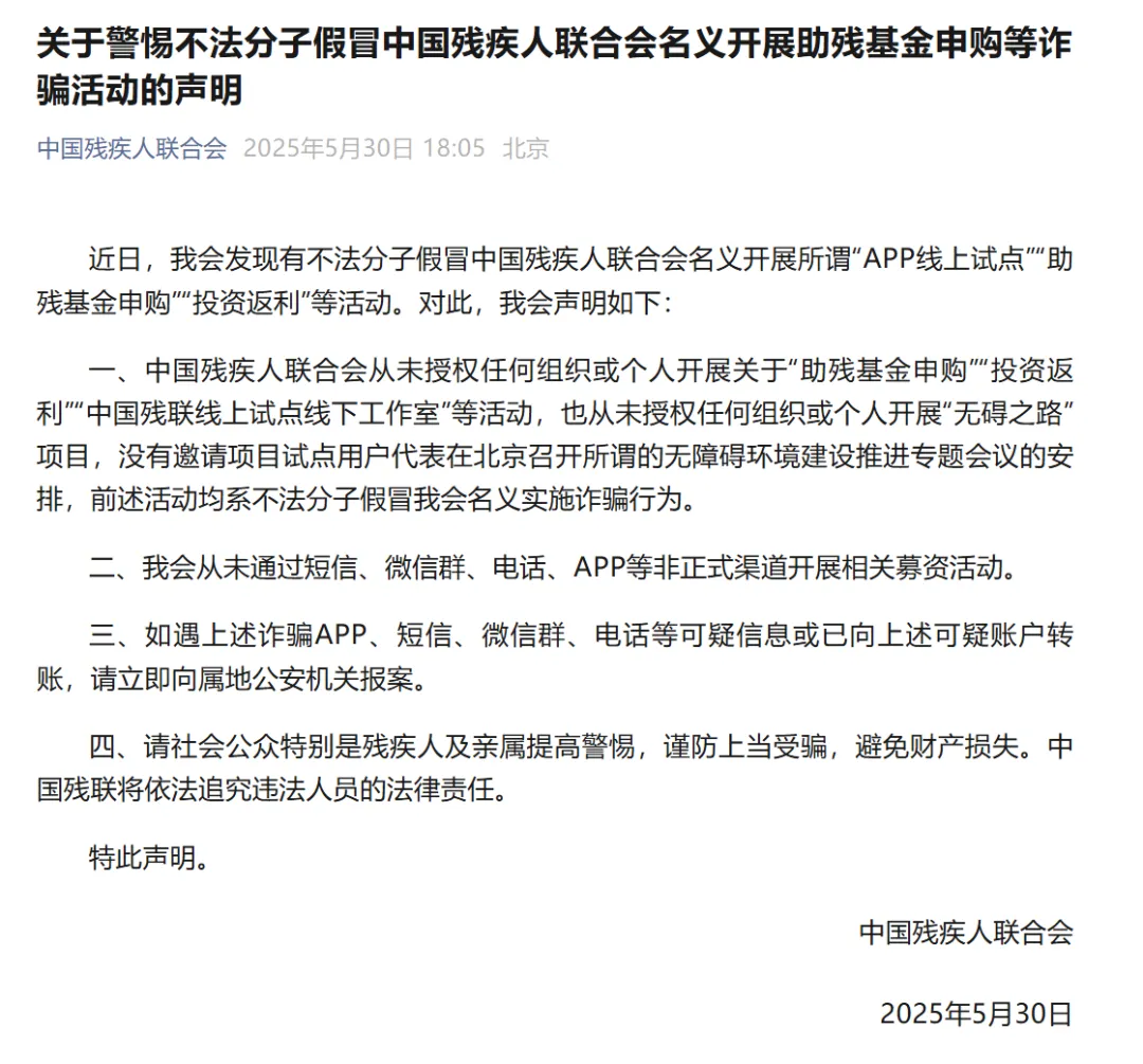 早在去年5月,中国残疾人联合会就曾发布声明,“从未授权任何组织或个人开展关于‘助残基金申购’‘投资返利’‘中国残联线上试点线下工作室’等活动。”