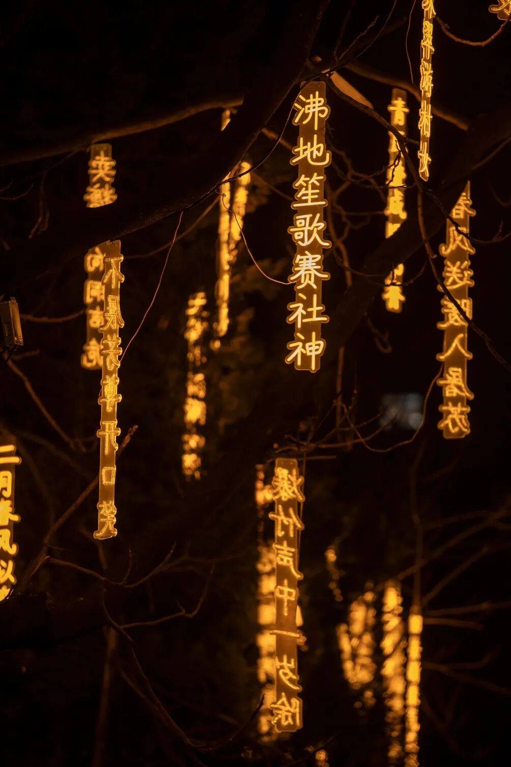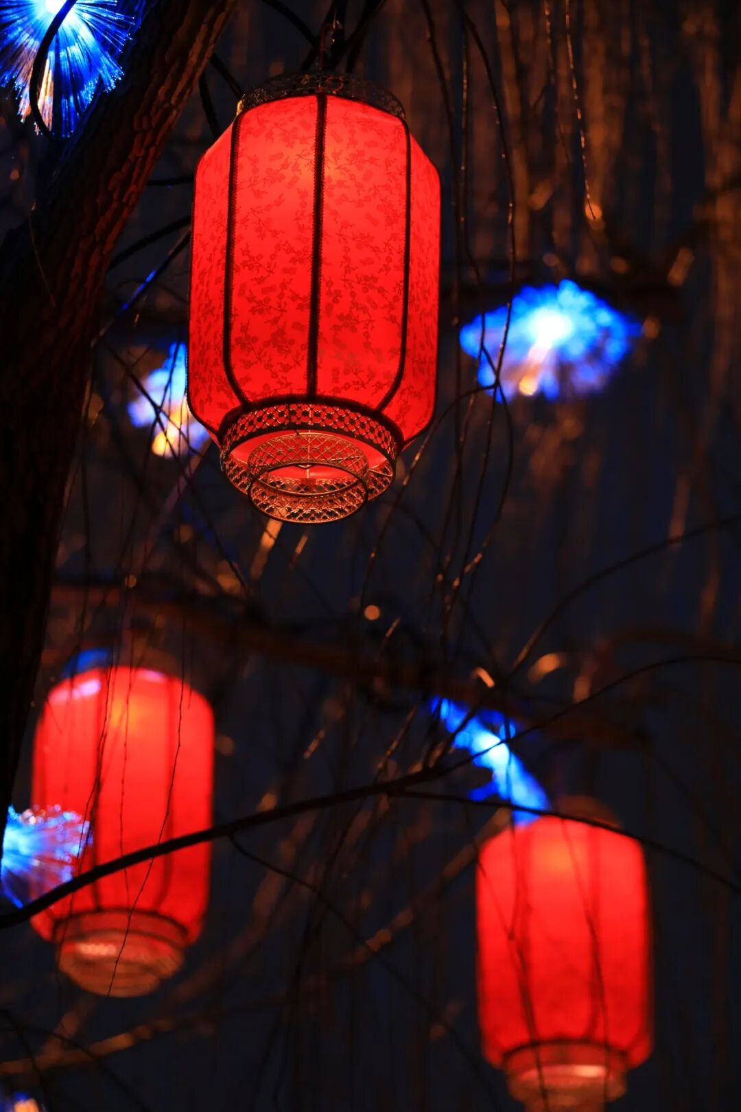 彩灯带缠绕枝头,红灯笼随风摇曳