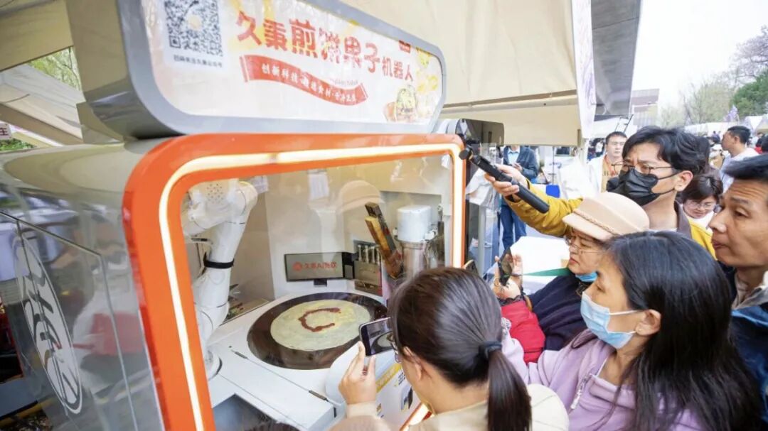 ▲顾客在煎饼机器人处购买煎饼。资料图