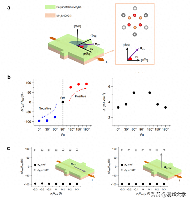 团队通过满足单晶和多晶Mn₃Sn所需的不同生长条件,利用分子束外延生长技术构筑了手性反铁磁Mn₃Sn同质结(图1a),利用Mn₃Sn(0001)产生面外自旋极化(σz),翻转在多晶Mn₃Sn层的手性反铁磁序。通过面内大磁场进行预磁化(图1a),操控Mn₃Sn(0001)层的磁序取向,进而控制磁自旋霍尔效应,实现零场翻转的开关和极性的反转(图1b)。对比铁磁翻转极易受外磁场的干扰,手性反铁磁的全电学翻转呈现出优越的抗磁场干扰特性(图1c)。