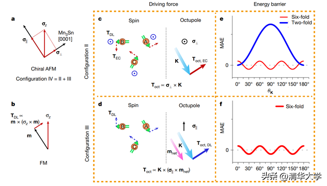 手性反铁磁是磁八极子的载体,这一磁序概念超越了常规的自旋和磁偶极子概念。亚晶格自旋和磁八极子,为理解手性反铁磁的动力学现象提供了两个截然不同的视角。研究团队从磁八极子视角出发,对自旋力矩特征(贡献翻转所需的驱动力)和磁各向异性特征(影响翻转所需克服的能垒)做了系统的理论分析,揭示了两方面关键机制:(1)磁易面约束下,手性反铁磁和铁磁对于面外自旋的响应有本质区别(图2a和b),垂直于磁易面的分量会产生交换耦合力矩(图2c),是高力矩效率的主要来源;而平行于磁易面的分量产生的驱动力(图2d)用以决定零场翻转的极性。手性反铁磁同质结中,面外自旋极化与Kagomé磁易面成倾斜的几何构型,既实现了全电学翻转,又保留了较高的力矩效率;(2)易面所贡献的能垒极低(图2e和f),利于高效翻转,然而却会使手性反铁磁的翻转不完全。而若为了实现100%翻转而引入二重磁各向异性,却会使能垒成数量级地提升,极大限制翻转效率。在传统的构型中,驱动力优势和能垒优势始终无法共存,而倾斜的几何构型(图2a)则成功突破了这一限制,形成了极高的电学翻转效率。