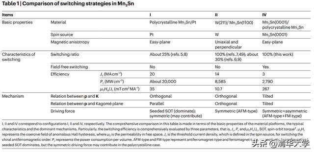 研究团队采用临界电流密度Jc、功耗Pc,以及反常霍尔矫顽力与临界电流密度的比值μ0Hc/Jc三项指标来综合评估翻转效率(表格1),新构型下,三项指标均比此前有了大幅优化,与铁磁相比,μ0Hc/Jc更是实现了两个数量级的提升。